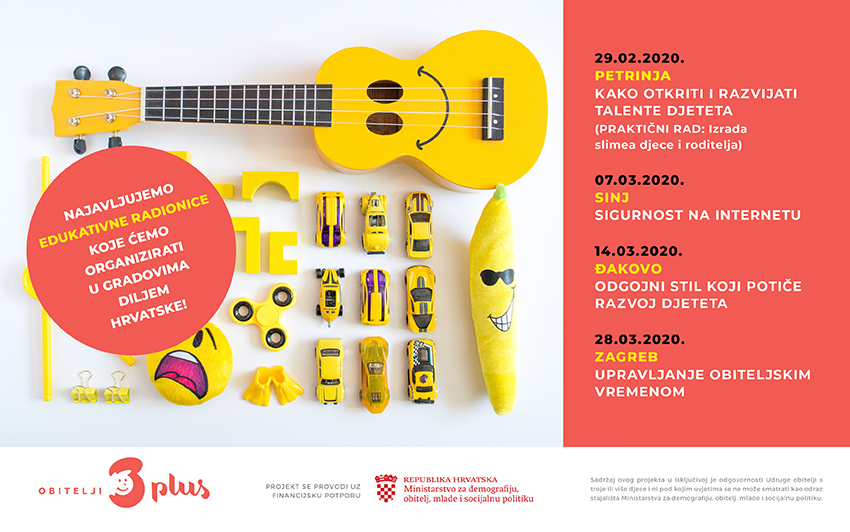 Jedan od ciljeva udruge Obitelji 3plus je osnaživanje obitelji te poticanje cjeloživotnog učenja sa svrhom unaprjeđenja znanja i vještina članova 3plus obitelji. Od ove godine krećemo s organiziranjem obiteljskih radionica odgovornog roditeljstva za obitelji s više djece, a prve četiri radionice bit će održane u Petrinji (29.02.), Sinju (07.03.), Đakovu (14.03.) i Zagrebu (28.03.). Zabilježite datume već sada i pratite našu Facebook stranicu za više informacija o prijavama.