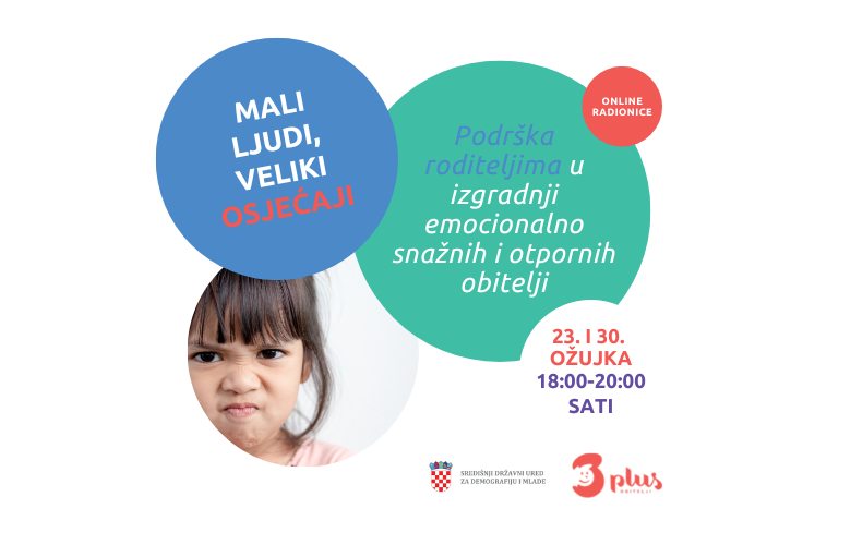 Organiziramo besplatne online radionice emocionalne pismenosti “Mali ljudi, veliki osjećaji” koje će osnažiti roditelje i naučiti lakše prepoznati svoje i dječje emocije. Roditelji će dobiti znanja potrebna za razumijevanje vlastitih i dječjih emocija te konkretne alate i vještine kako bi se bolje nosili s vlastitim i dječjim emocijama.