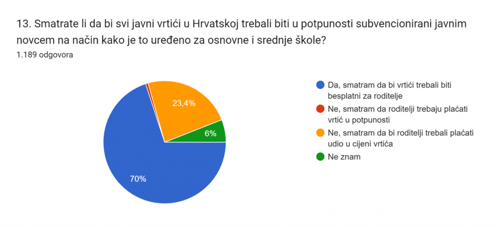 70 % ispitanika smatra da bi svi javni vrtići u Hrvatskoj trebali biti u potpunosti subvencionirani javnim novcem na način kako je to uređeno za osnovne i srednje škole, dok preostali dio roditelja ne smatra to potrebnim ili izvodljivim.