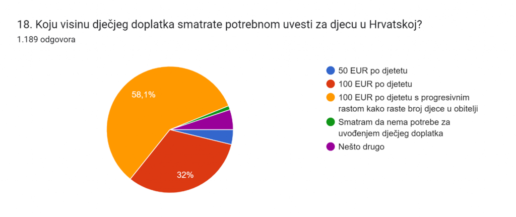 39 % ispitanika korisnici su dječjeg doplatka, 58 % roditelja smatra da je potrebno uvesti dječji doplatak za svako dijete u visini 100 EUR-a po djetetu s progresivnim rastom kako raste broj djece u obitelji dok 32 % smatra da je potrebno uvesti dječji doplatak u visini od 100 EUR-a po djetetu. Više od 73 % roditelja ističe da bi uvođenje dječjeg doplatka u iznosu od 100 EUR-a za svako dijete značajno ili u velikoj mjeri utjecalo na podizanje kvalitete života u njihovoj obitelji, dok samo 6 % navodi kako to ne bi utjecalo na kvalitetu života njihove obitelji.