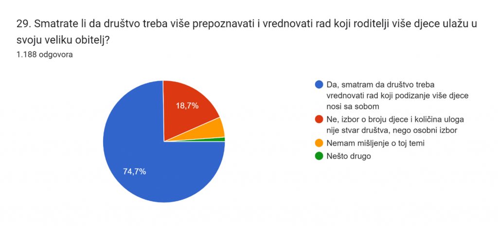 Gotovo 75 % roditelja smatra da društvo treba vrednovati rad koji podizanje više djece nosi sa sobom dok 19 % roditelja smatra da izbor o broju djece i količina uloga nije stvar društva, nego osobni izbor.