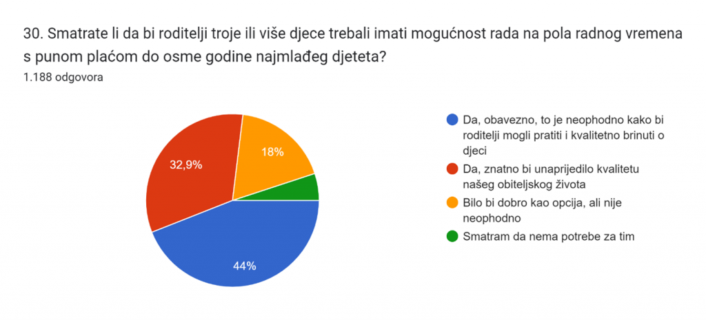 77 % roditelja smatra da bi roditelji troje ili više djece trebali imati mogućnost rada na pola radnog vremena s punom plaćom do osme godine života najmlađeg djeteta.