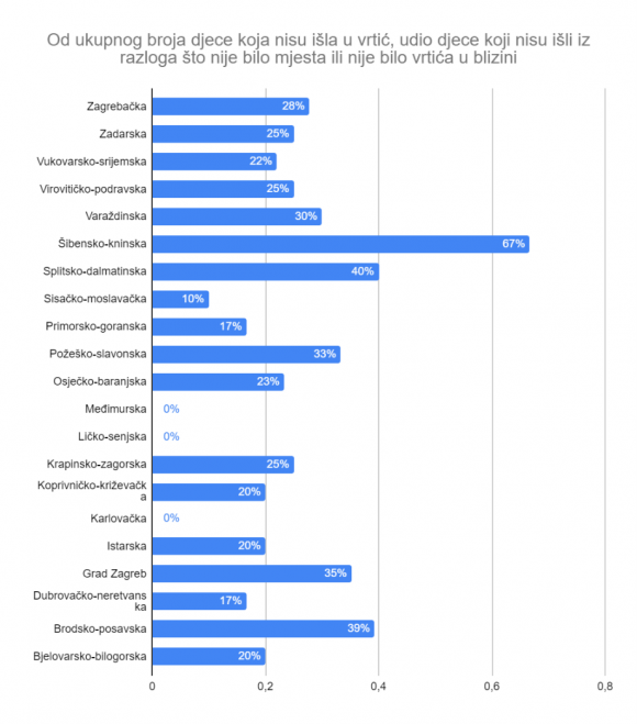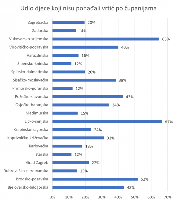 Pri pregledu po županijama možemo vidjeti da je udio djece koja nisu pohađala vrtić jer nije bilo mjesta ili nisu imali vrtić u blizini najveći u Šibensko-kninskoj županiji, a slijedi ju Splitsko-dalmatinska i Brodsko-posavska županija.