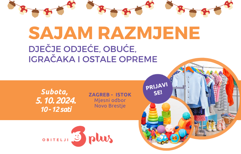 Podružnica udruge Obitelji 3plus – Grad Zagreb poziva Vas na prvi jesenski Sajam razmjene dječje odjeće, obuće, igračaka i ostale opreme koji će se održati 5. listopada 2024. od 10 do 12 sati u Mjesnom odboru Novo Brestje (Ulica ljubičica 33). Prijave za sudjelovanje su otvorene.